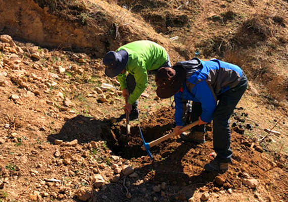 由于卡洛村郎機(jī)嶺溝泥石流勘查設(shè)計(jì)項(xiàng)目地處藏區(qū),語(yǔ)言不通等因素,項(xiàng)目組人員便自行購(gòu)置鋤頭、鐵鍬等工具,開展槽探和采集樣品工作。頂著高原的烈日,在海拔近4000m的斜坡開展詳細(xì)地質(zhì)調(diào)繪和地形圖測(cè)量工作,方便米飯和涼水便解決了一日三餐,但項(xiàng)目組人員沒一人喊苦叫累。終于,經(jīng)過(guò)兩天的辛苦工作,項(xiàng)目組順利完成了郎機(jī)嶺溝泥石流勘查設(shè)計(jì)項(xiàng)目野外工作。