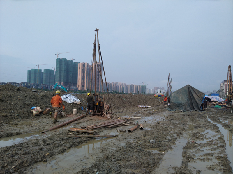 該項(xiàng)目巖土工程勘察原計(jì)劃工期為20個(gè)日歷天,勘探鉆孔782個(gè)、鉆探工作量17118米。開工初期,雖然調(diào)集了30臺(tái)鉆機(jī)進(jìn)場,但要滿足建設(shè)單位的工期要求,仍存在很大差距,加之連續(xù)下雨導(dǎo)致場地積水嚴(yán)重且泥濘不堪,勘探進(jìn)度十分緩慢,我院水文地質(zhì)工程公司迅速組織安排專人聯(lián)系成都、重慶、成都周邊地區(qū)的數(shù)十支鉆探隊(duì)伍,鉆機(jī)增至50臺(tái)。