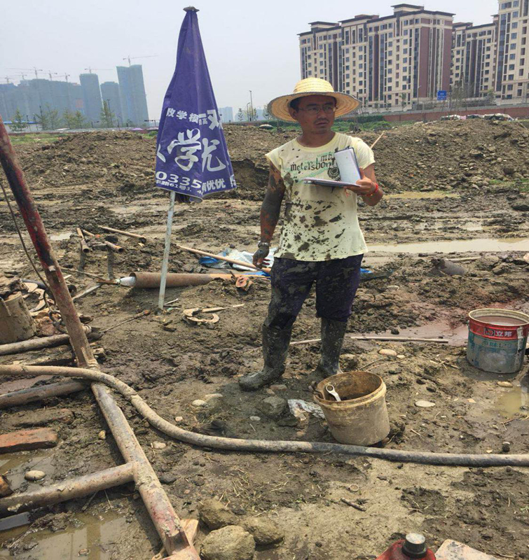 在泥濘場地中安排鉆探生產(chǎn)的項(xiàng)目負(fù)責(zé)人范偉 勘察項(xiàng)目現(xiàn)場實(shí)測溫度約46度