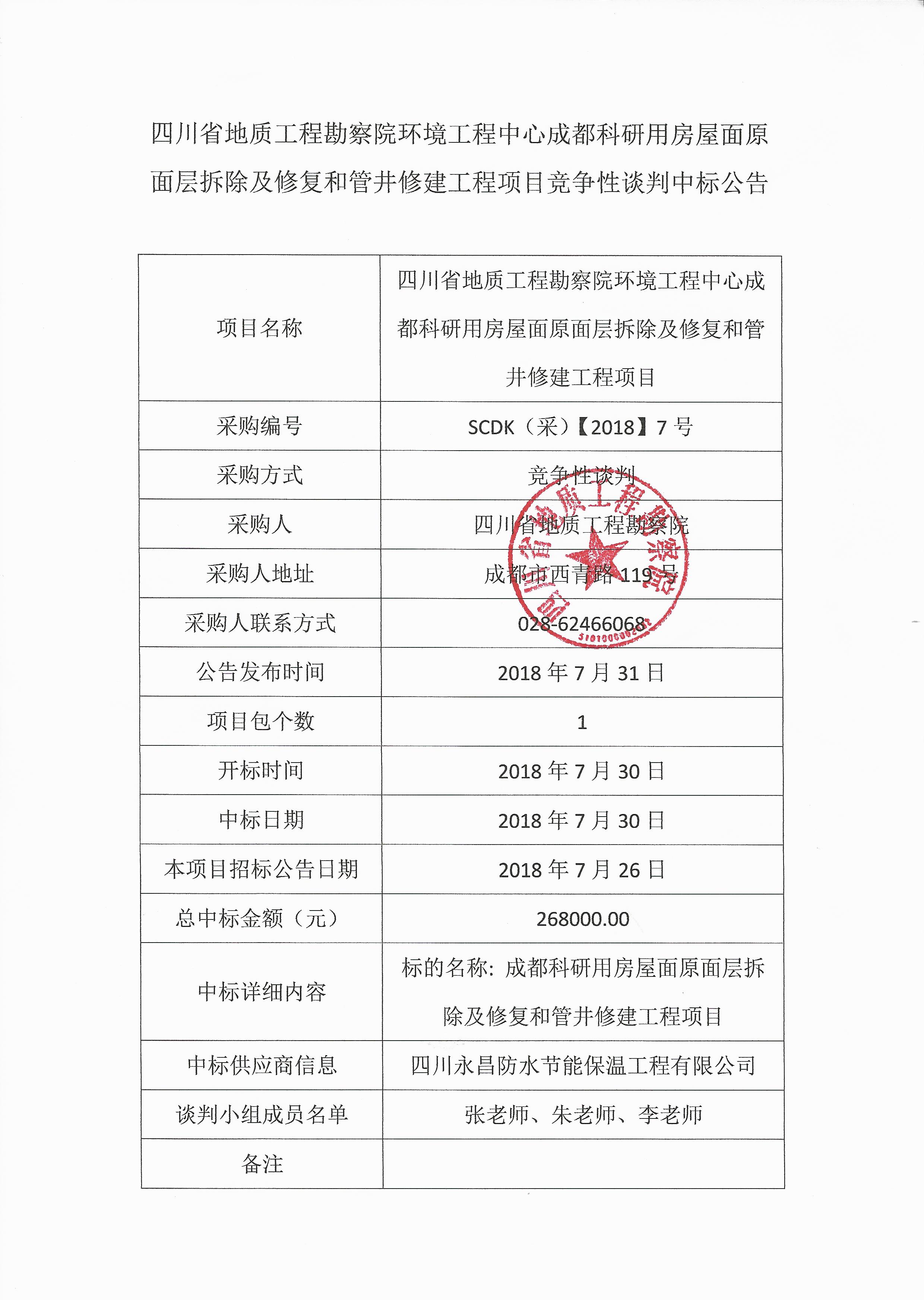 四川省地質(zhì)工程勘察院成都科研用房屋面原面層拆除及恢復和管井修建工程項目競爭性談判中標公告