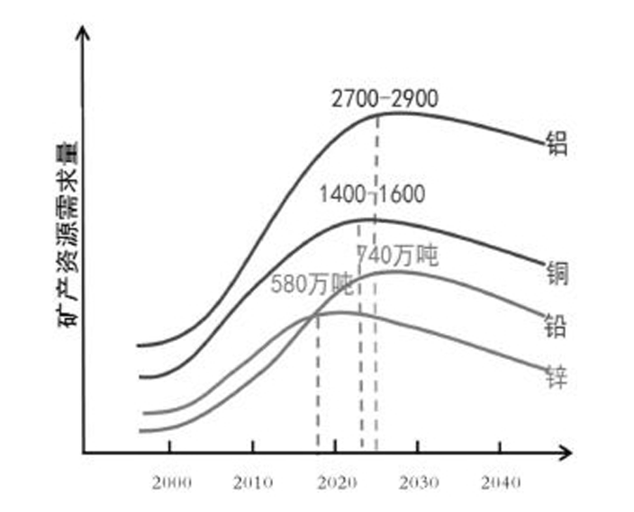 王安建教授預測,達到峰值的礦產需求總量會很高。預計鋼鐵消費的峰值大致是在7億噸~7.5億噸;能源消費的峰值大約出現在2030年,大約消費40億~42億噸;我國銅的消費峰值大致在2022年~2025年,大約消費1300萬噸~1500萬噸;鋁的消費峰值大致在2022年~2025年, 消費2700萬噸~2900萬噸;鉛、鋅的消費峰值大致在2022年左右,鉛大約消費680萬噸~700萬噸,鋅大約消費770萬噸~790萬噸。